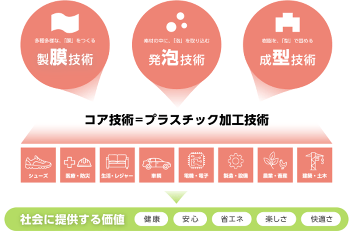 アキレスの強みは、シューズ事業で培ったブランド力に加え、多岐にわたる産業分野へ素材を供給する多角的な事業構造にあります。需要に応じ様々な機能を付与した中間素材・生産資材の提供は、当社の経営基盤を強固に支える柱です。 アキレスは、バランスの取れた事業戦略で、持続的な企業価値の向上を目指します。