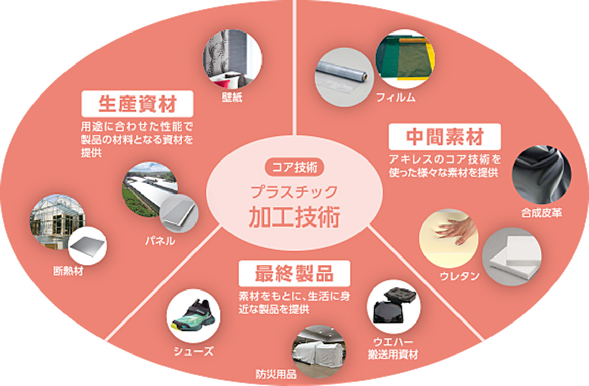 アキレスはプラスチック加工技術をコアに、日用生活品から産業用途まで多岐にわたる製品を世界に提供しています。