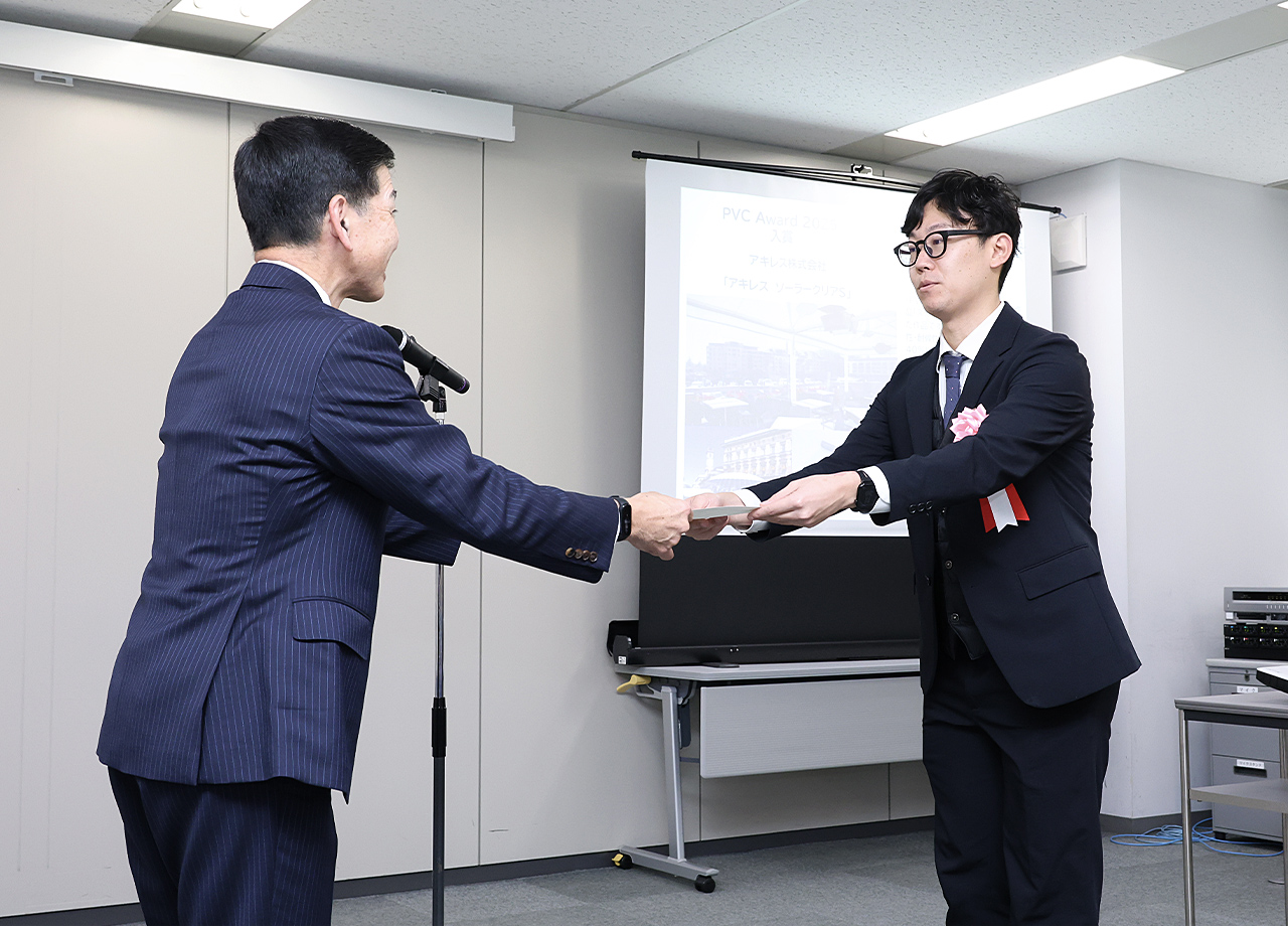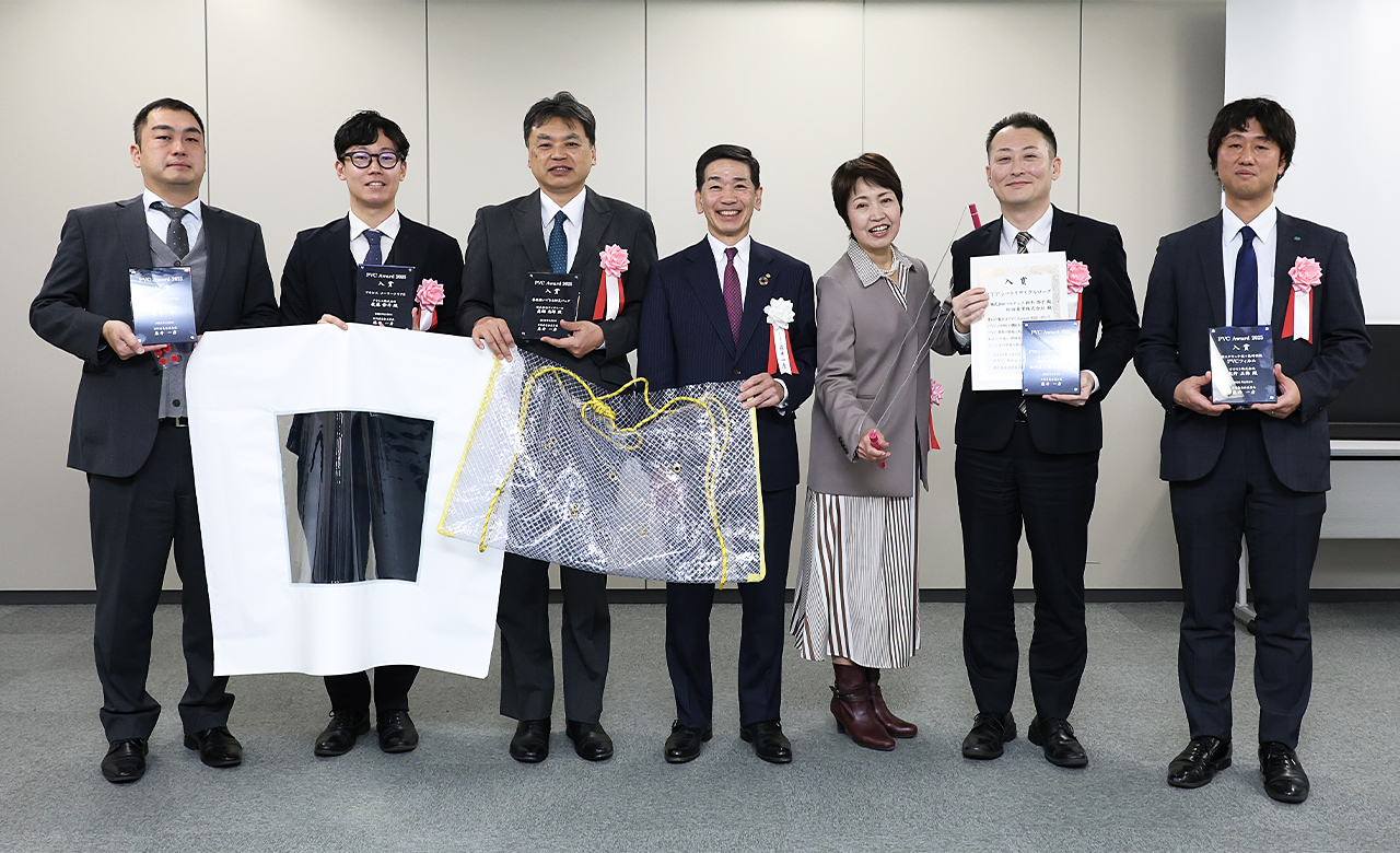 塩ビ工業・環境協会が、日本ビニル工業会、日本ビニール商業連合会、日本プラスチック製品加工組合連合会、日本住宅リフォーム産業協会と共同で主催する「PVC Award 2025」で、当社フイルム販売部の「アキレス ソーラークリアS」が入賞し、2026年2月6日(金)に住友不動産六甲ビルにて表彰式が行われました。「PVC Award 2025」は、PVC(塩ビ)素材の優れた特長を活かして、生活の利便性向上、環境配慮・リサイクル・安全・防災・社会貢献などのニーズに応える製品を公募するコンテストです。今回は94点の応募があり、大賞は「該当なし」でしたが、準大賞2点、優秀賞3点など、計15作品が選定されています。 遮熱や浸水防止などの防災・環境対策、推し活グッズなどが複数受賞し、塩ビ素材の用途の幅広さを再認識いたしました。