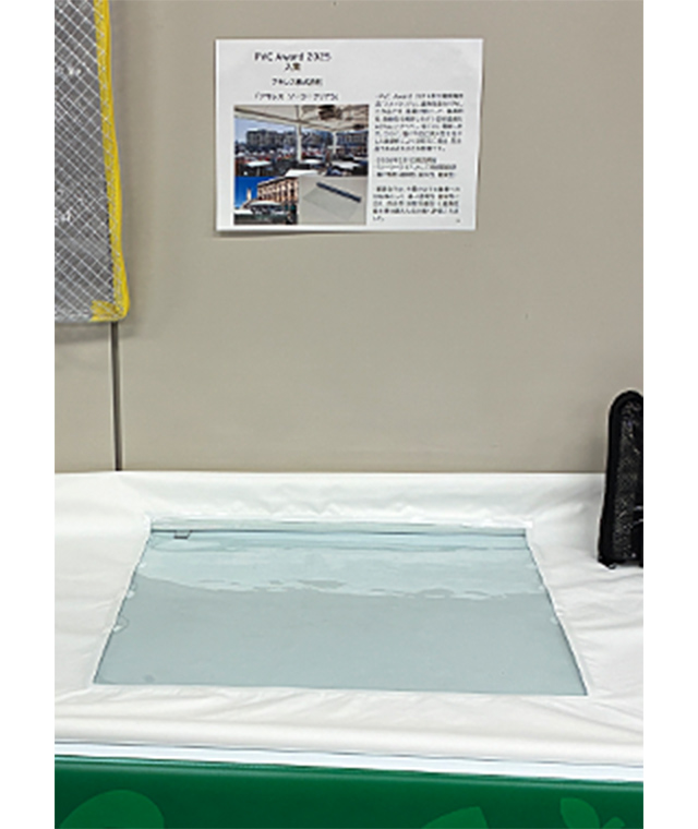 PVC Award 2019準大賞受賞作品「スカイクリア」に遮熱性能を付与した作品です。猛暑対策として、高透明性・対応性を維持しながら日射透過を40%以上カットし、省エネに貢献します。さらに、塩ビの自己消火性を活かした難燃性により消防法に適合、防炎品でもある点も大きな特長です。酷暑への対応策として、高い透明性・対候性に加え、防炎性(消防法適合)と遮熱性能を兼ね備えた点が高く評価されました。