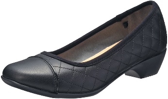 今回の「3cmヒールスクエアトー」は、歩きやすさとシンプルな外観がポイントですが、新色のブラックキルティングは、つま先をあえてエナメルからスムースに変更。アッパー(甲)はキルティング調でコーディネートしやすい外観ながらも、おとなしくなり過ぎないデザインが特長です。スタイルアップも期待できるヒール高約3cmでスカートにもパンツにも合わせやすい一足です。