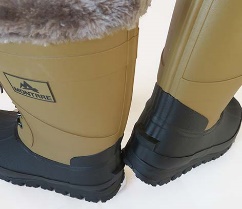 また、総丈約30cm(Mサイズ時)のボディは軽量配合ラバーを使用、裏地には起毛布+厚さ6mmのウレタン、インソール(中敷き)表面にはボアを採用し、軽さと暖かさにも配慮。履き口周りの寸法は約38cm(Mサイズ時)で脱ぎ履きも快適。ヒール高は約3cmで底冷えにも対応。踵部分には、両手が塞がっていても靴が脱げる突起(キックダウングリップ)を装着しています。