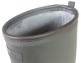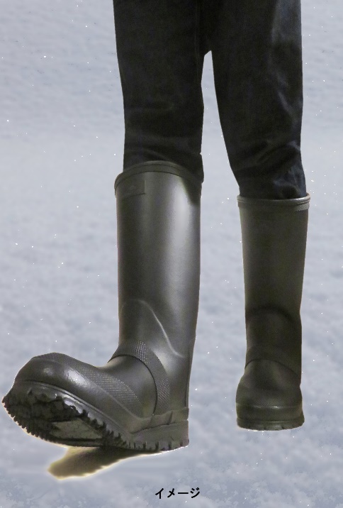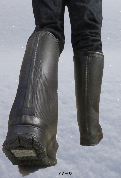 また、軽さと暖かさを考慮したボディは、膝下まで覆う総丈約40cm(Mサイズ時)の軽量配合ラバー、裏地には起毛布+厚さ6mmのウレタンを使用しています。履き口周りの寸法は約40cm(Mサイズ時)と広め。踵部分には、両手が塞がっていても靴が脱ぎやすい突起(キックダウングリップ)を装着しスマートな脱ぎ履きにも配慮しています。ヒール高は約4cm(Mサイズ時)で底冷えにも対応。
