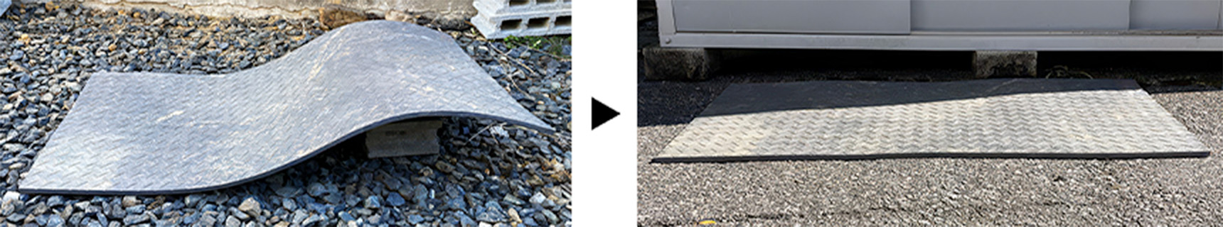 | ■反りやたわみが生じても約1日で復元 柔軟性に優れ、凹凸がある接地面にも良好に追従。反りやたわみが生じても平地に置けば約1日で元の形状に復元します(自社試験)。 |