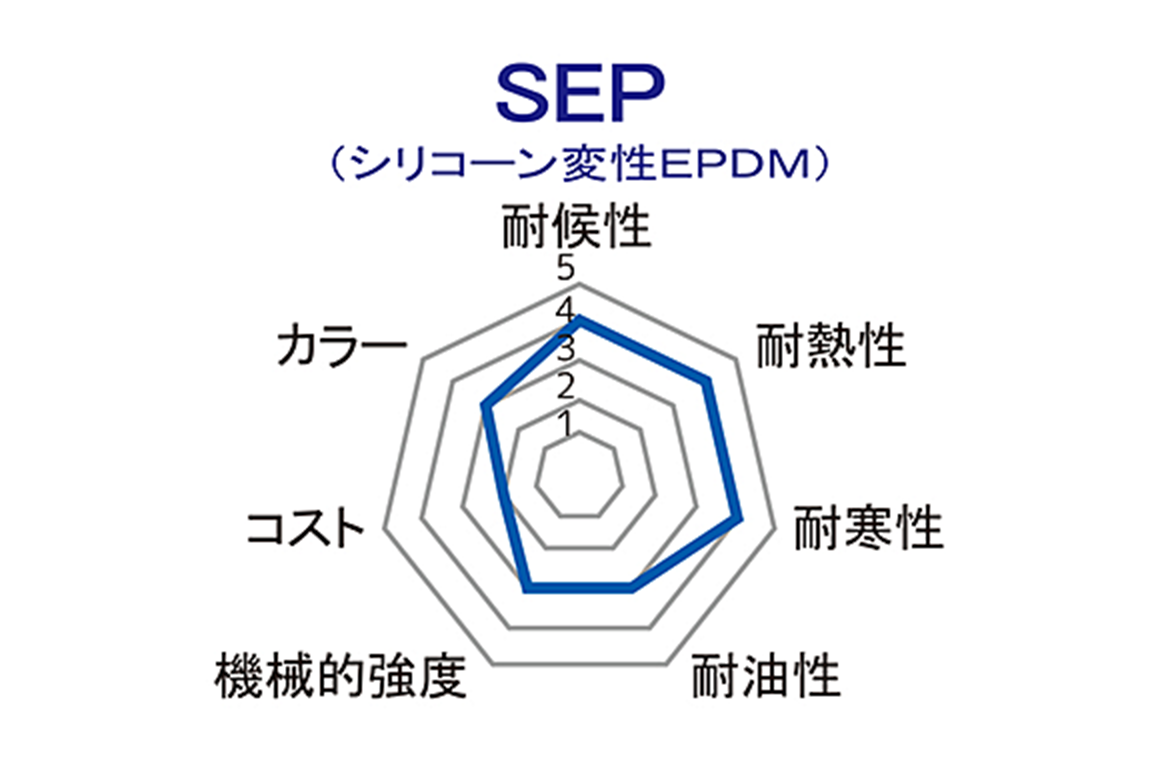 EPDM(エチレンプロピレンジエンゴム)をSI(シリコーンゴム)で変成し、耐熱性・耐候性・耐寒性を付与させた機能性ゴム引布です。性能的にはSIとEPDMの中間に位置し、耐熱性・耐寒性双方のバランスに優れます。